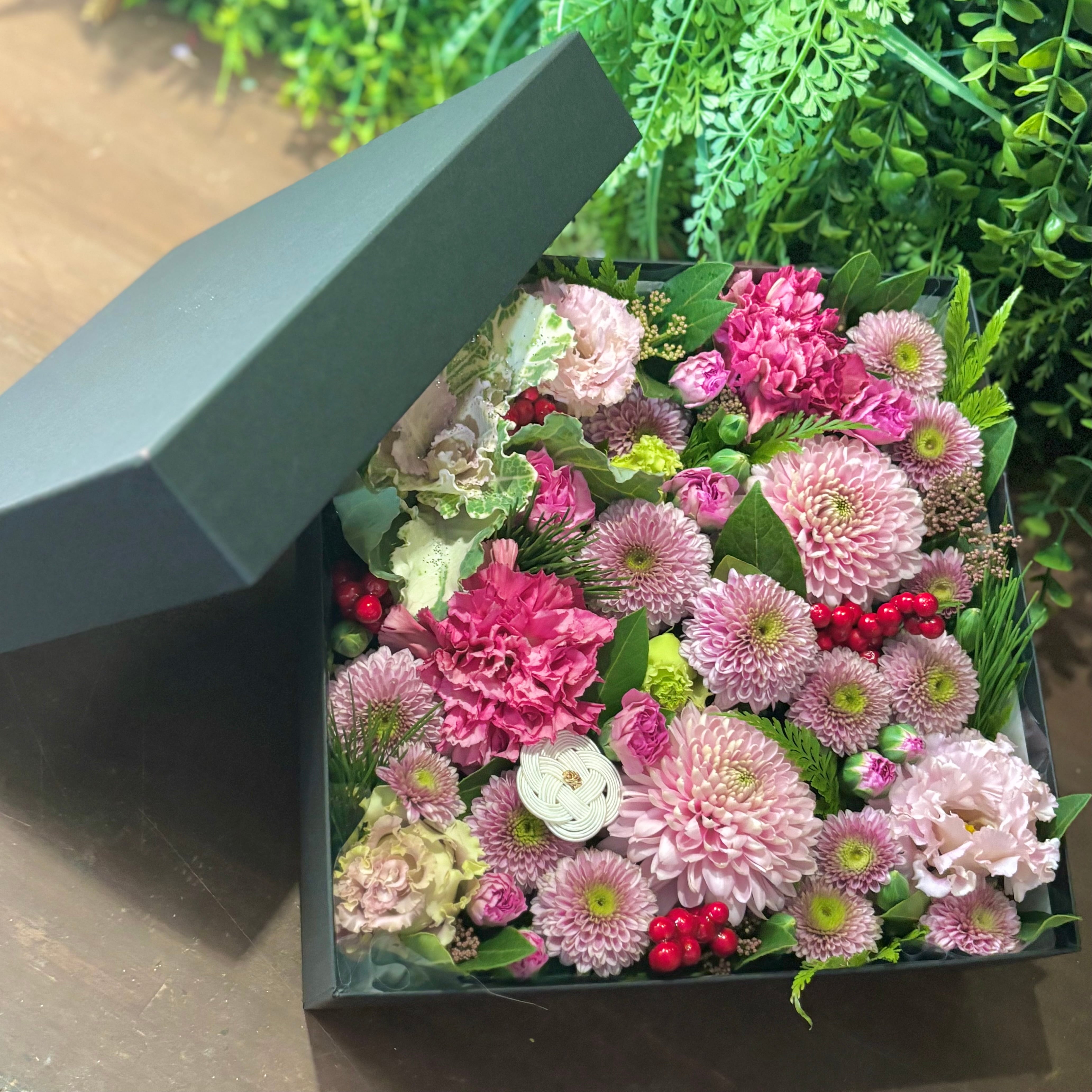 BOXアレンジは、箱の中に季節の花々をぎゅっと詰め込んだエレガントなフラワーギフトです。